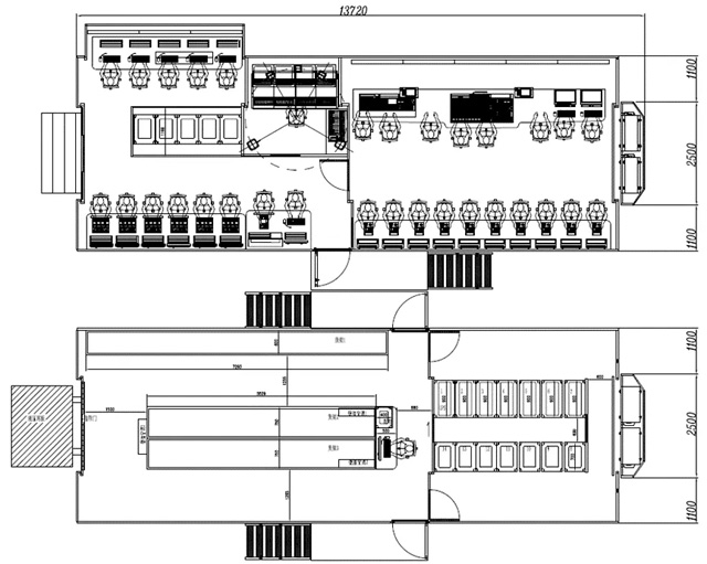 由于收車時(shí)內(nèi)套拉箱頂收回,強(qiáng)冷機(jī)柜若在拉箱區(qū),出回風(fēng)會(huì)很難設(shè)計(jì),所以通常將強(qiáng)冷柜放在不帶拉箱的部位,加上兩側(cè)拉箱總寬度不得超2.5米,這導(dǎo)致整個(gè)廂體很難做大,以下是幾種最常見(jiàn)的布局,基本都是配備4組強(qiáng)冷機(jī)柜,如果想要增加強(qiáng)冷機(jī)柜數(shù)量,就需要減小拉箱面積,這就會(huì)影響到制作區(qū)和技術(shù)區(qū)面積。無(wú)論是單外套還是雙外套,由于拉箱頂在主頂外邊,強(qiáng)冷的出回風(fēng)就比較好設(shè)計(jì),但同樣受到兩側(cè)拉箱總寬度不得超2.5米的限制,廂體也不可能做太大,可以考慮配合第三級(jí)內(nèi)套拉箱使用由于內(nèi)外套是采用上下疊加的形式,避開了左右相加不能超2.55米的限制,所以設(shè)計(jì)起來(lái)就比較靈活,也能做得更大,強(qiáng)冷區(qū)只要避開內(nèi)套拉箱,出回風(fēng)也比較好設(shè)計(jì)。以下是最近國(guó)內(nèi)比較常見(jiàn)的布局。